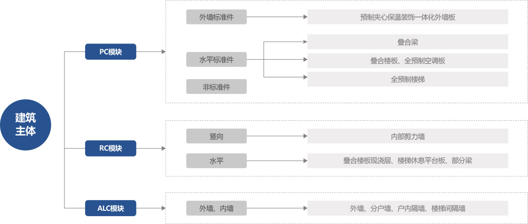 建筑主體可分為現澆模塊和預制模塊,預制模塊又可分為PC模塊和ALC模塊。